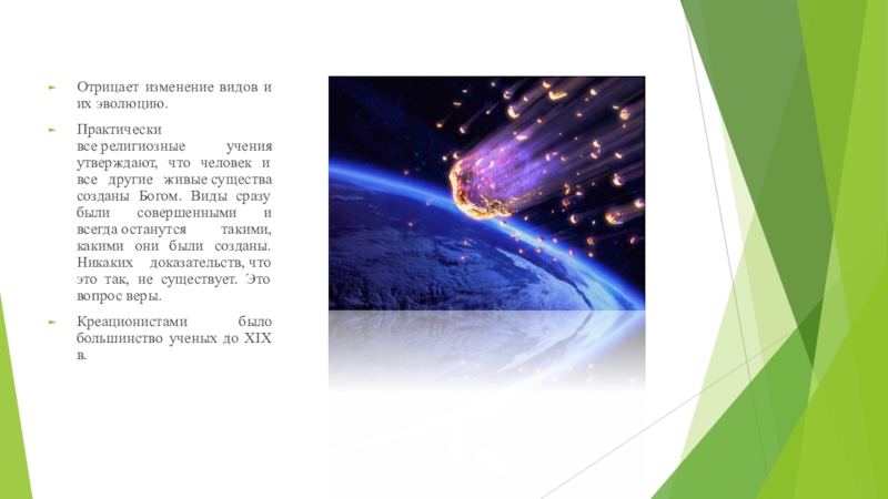 Слайд 27Отрицает изменение видов и их эволюцию.