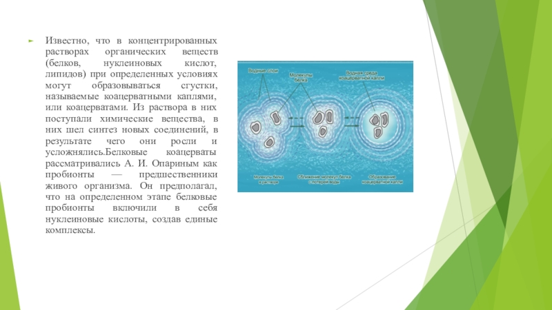 или коацерватами. Из раствора в них поступали химические вещества, в них шел синтез новых соединений, в результате чего они росли и усложнялись.Белковые коацерваты рассматривались А. И. Опариным как пробионты — предшественники живого организма. Он предполагал, что на определенном этапе белковые пробионты включили в себя нуклеиновые кислоты, создав единые комплексы.