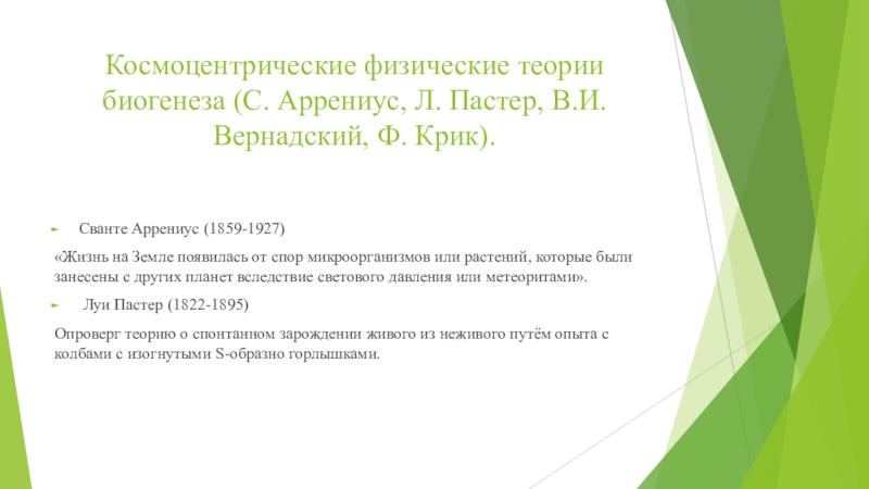 Слайд 24Космоцентрические физические теории биогенеза (С. Аррениус, Л. Пастер, В.И. Вернадский,