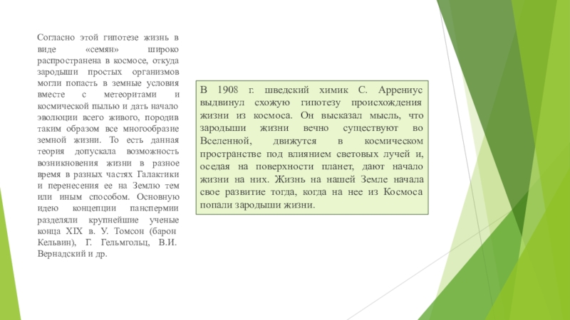 В 1908 г. шведский химик С. Аррениус выдвинул схожую гипотезу происхождения жизни из космоса. Он высказал мысль, что зародыши жизни вечно существуют во Вселенной, движутся в космическом пространстве под влиянием световых лучей и, оседая на поверхности планет, дают начало жизни на них. Жизнь на нашей Земле начала свое развитие тогда, когда на нее из Космоса попали зародыши жизни.
