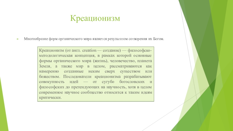 основные формы органического мира (жизнь), человечество, планета Земля, а также мир в целом, рассматриваются как намеренно созданные неким сверх существом или божеством. Последователи креационизма разрабатывают совокупность идей — от сугубо богословских и философских до претендующих на научность, хотя в целом современное научное сообщество относится к таким идеям критически.