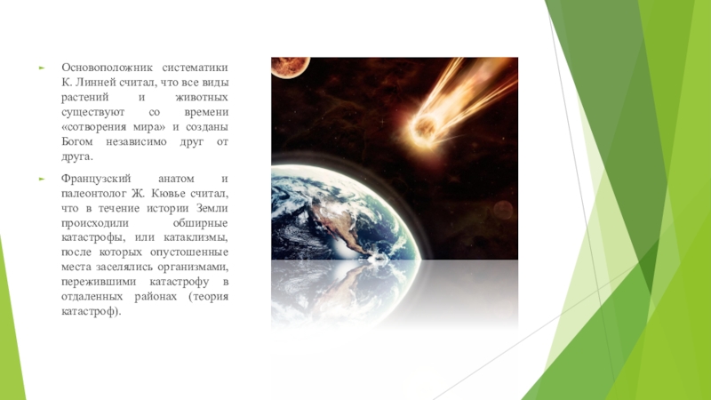 Французский анатом и палеонтолог Ж. Кювье считал, что в течение истории Земли происходили обширные катастрофы, или катаклизмы, после которых опустошенные места заселялись организмами, пережившими катастрофу в отдаленных районах (теория катастроф).