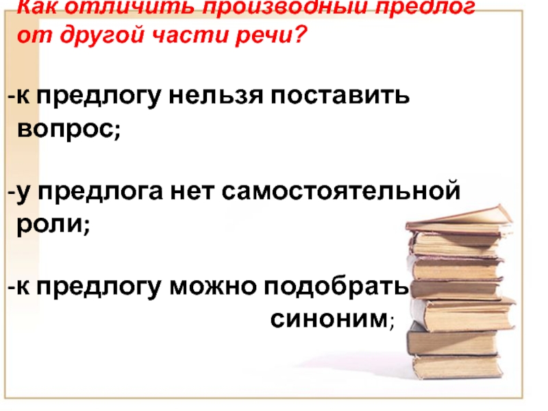 Как отличить производный предлог от другой части речи?к предлогу нельзя поставить вопрос;у предлога нет самостоятельной роли;к предлогу