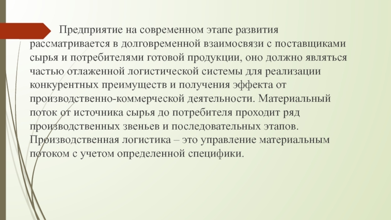 отлаженной логистической системы для реализации конкурентных преимуществ и получения эффекта от производственно-коммерческой деятельности. Материальный поток от источника сырья до потребителя проходит ряд производственных звеньев и последовательных этапов. Производственная логистика – это управление материальным потоком с учетом определенной специфики.