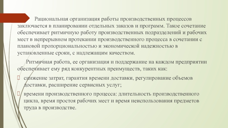 Ритмичная работа, ее организация и поддержание на каждом предприятии обеспечивает ему ряд конкурентных преимуществ, таких как: