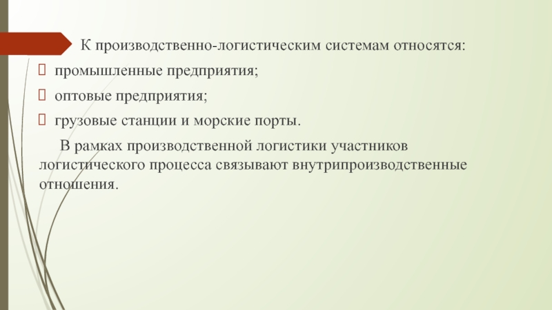 К производственно-логистическим системам относятся:промышленные предприятия;оптовые предприятия;грузовые станции и морские порты.	В рамках производственной логистики участников логистического процесса связывают