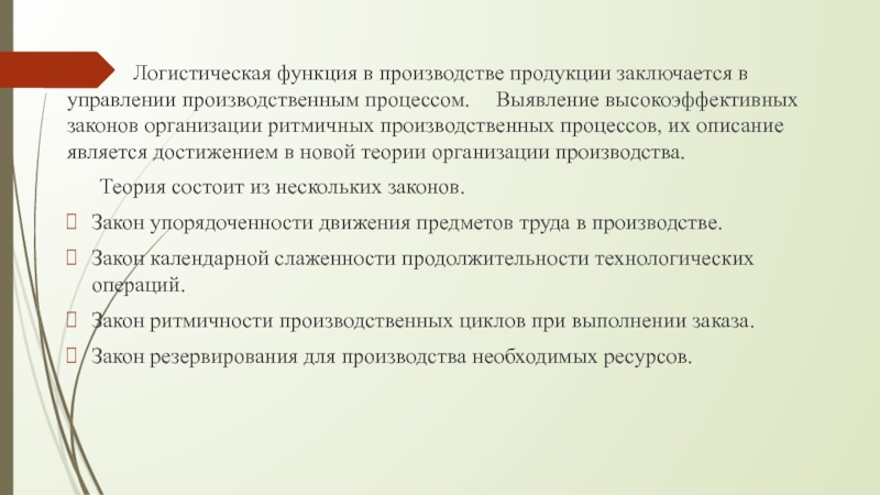 Логистическая функция в производстве продукции заключается в управлении производственным процессом. 	Выявление высокоэффективных законов организации ритмичных производственных процессов,