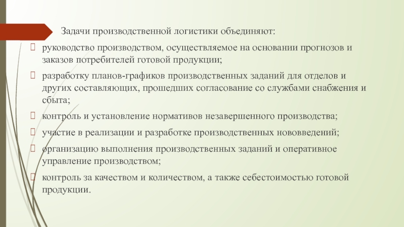 Задачи производственной логистики объединяют:руководство производством, осуществляемое на основании прогнозов и заказов потребителей готовой продукции;разработку планов-графиков производственных заданий
