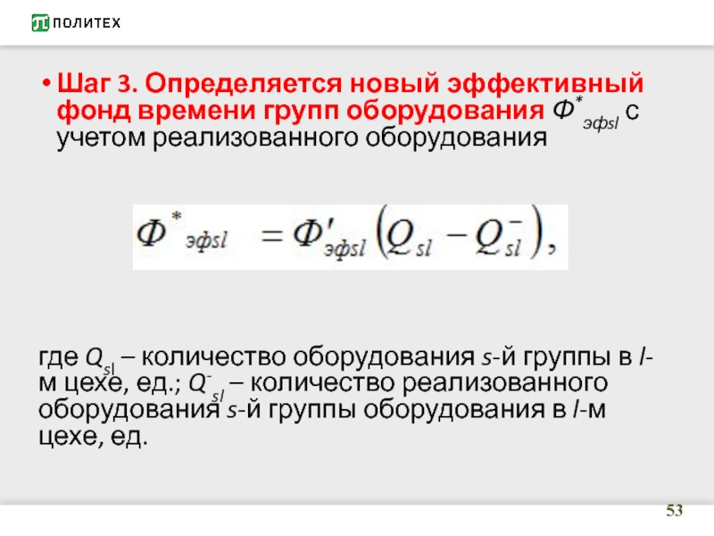 Слайд 53Шаг 3. Определяется новый эффективный фонд времени групп оборудования Ф*эфsl