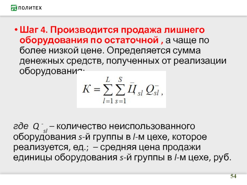 Слайд 54Шаг 4. Производится продажа лишнего оборудования по остаточной , а