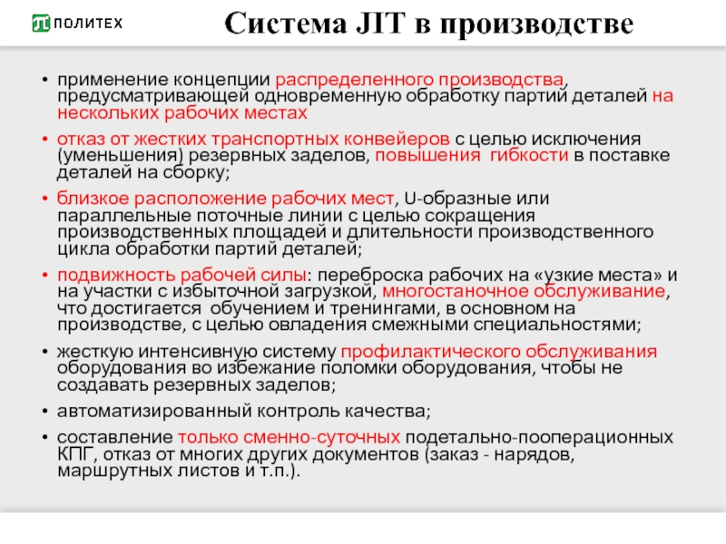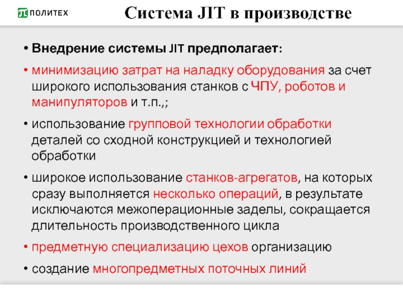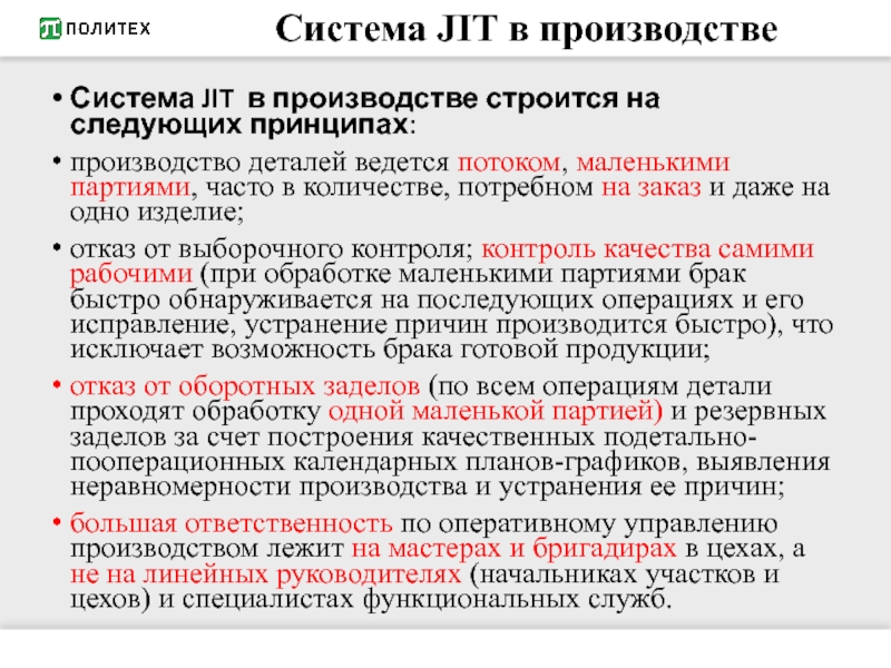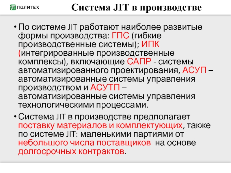 Система JIT в производстве предполагает поставку материалов и комплектующих, также по системе JIT: маленькими партиями от небольшого числа поставщиков на основе долгосрочных контрактов.
