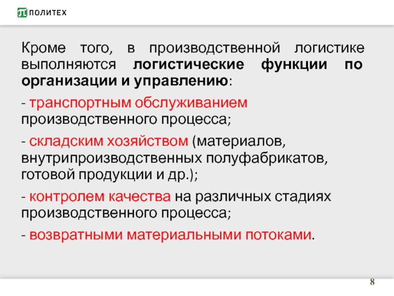 Слайд 8Кроме того, в производственной логистике выполняются логистические функции по организации