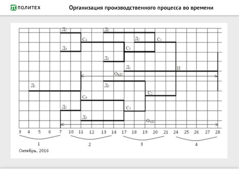 В серийном, например, производстве это – размеры и ритмы запуска и выпуска партий предметов, длительность производственного цикла обработки партий предметов, заделы (цикловые, оборотные, резервные), опережения запуска и выпуска партий предметов.
