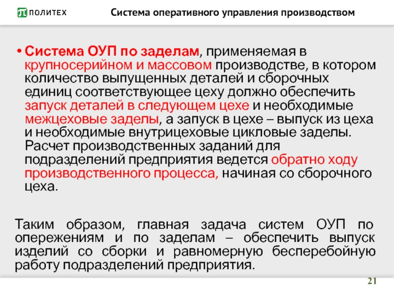 работу оборудования и рабочих, и непрерывную (без пролеживания) обработку деталей в процессе производства.