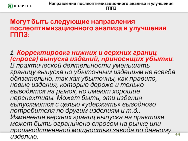 Слайд 50Направления послеоптимизационного анализа и улучшения ГППЗ