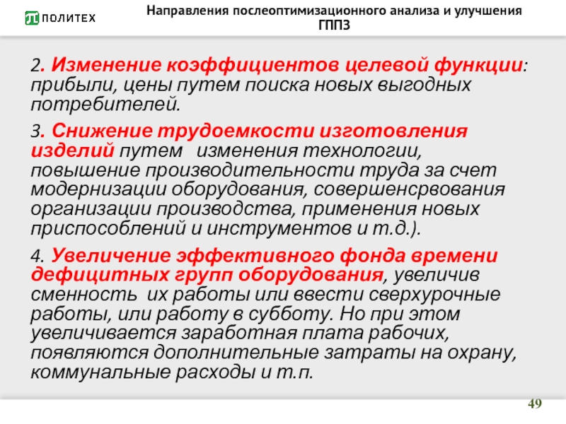 Слайд 49Направления послеоптимизационного анализа и улучшения ГППЗ