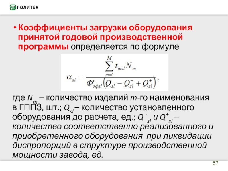 Слайд 57Коэффициенты загрузки оборудования принятой годовой производственной программы определяется по формуле