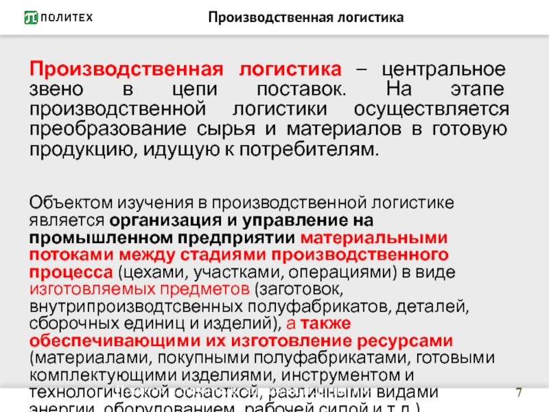 Слайд 7Производственная логистика – центральное звено в цепи поставок. На этапе