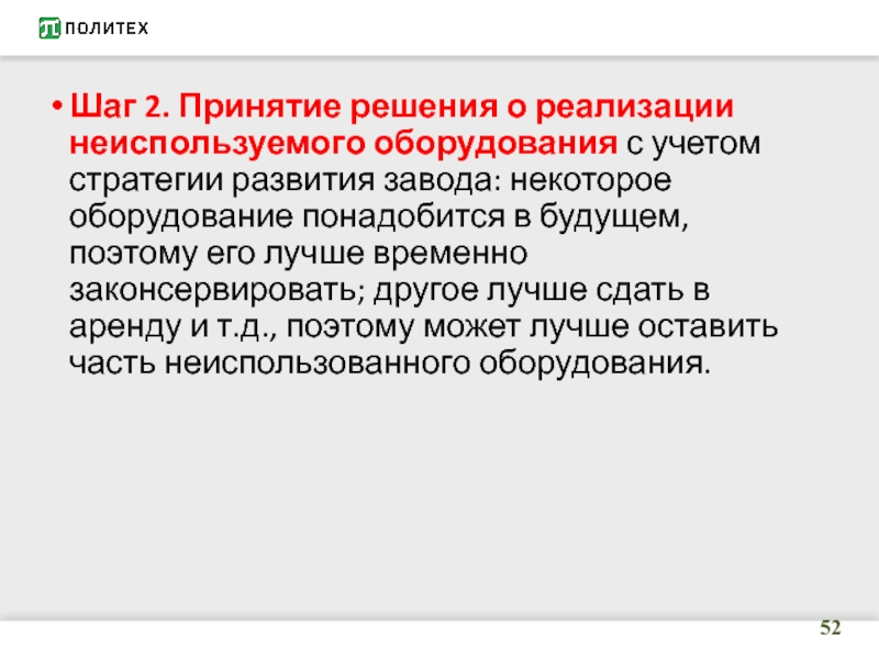 Слайд 52Шаг 2. Принятие решения о реализации неиспользуемого оборудования с учетом