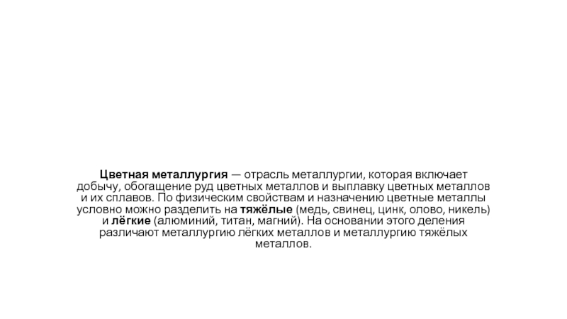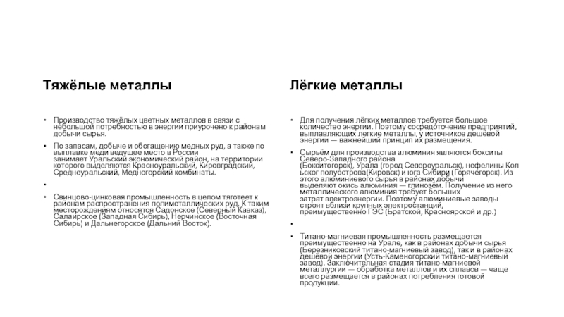 Для получения лёгких металлов требуется большое количество энергии. Поэтому сосредоточение предприятий, выплавляющих легкие металлы, у источников дешёвой энергии — важнейший принцип их размещения.