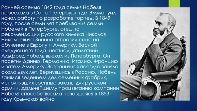 Слайд 3Ранней осенью 1842 года семья Нобеля переехала в Санкт-Петербург, где
