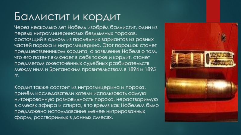 Баллистит и кордит Через несколько лет Нобель изобрёл баллистит, один из первых нитроглицериновых бездымных порохов, состоящий в