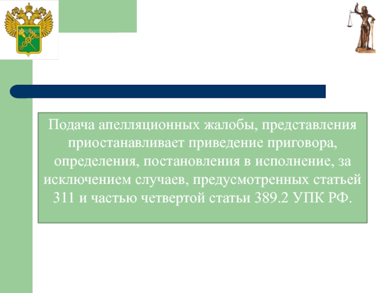 Слайд 9Подача апелляционных жалобы, представления приостанавливает приведение приговора, определения, постановления в