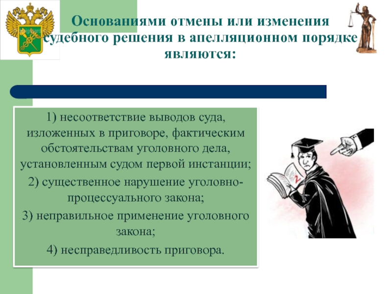 Слайд 21Основаниями отмены или изменения судебного решения в апелляционном порядке являются: