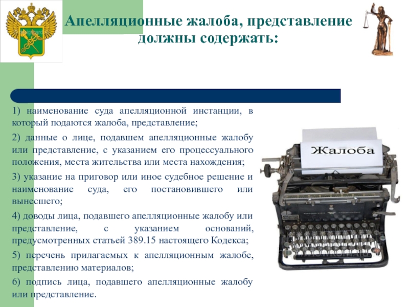 Слайд 8Апелляционные жалоба, представление должны содержать: