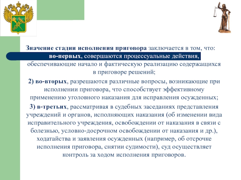 2) во-вторых, разрешаются различные вопросы, возникающие при исполнении приговора, что способствует эффективному применению уголовного наказания для исправления осужденных;
