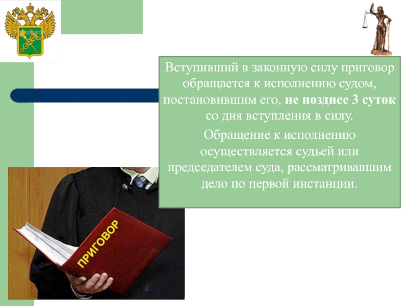 Слайд 28Вступивший в законную силу приговор обращается к исполнению судом, постановившим