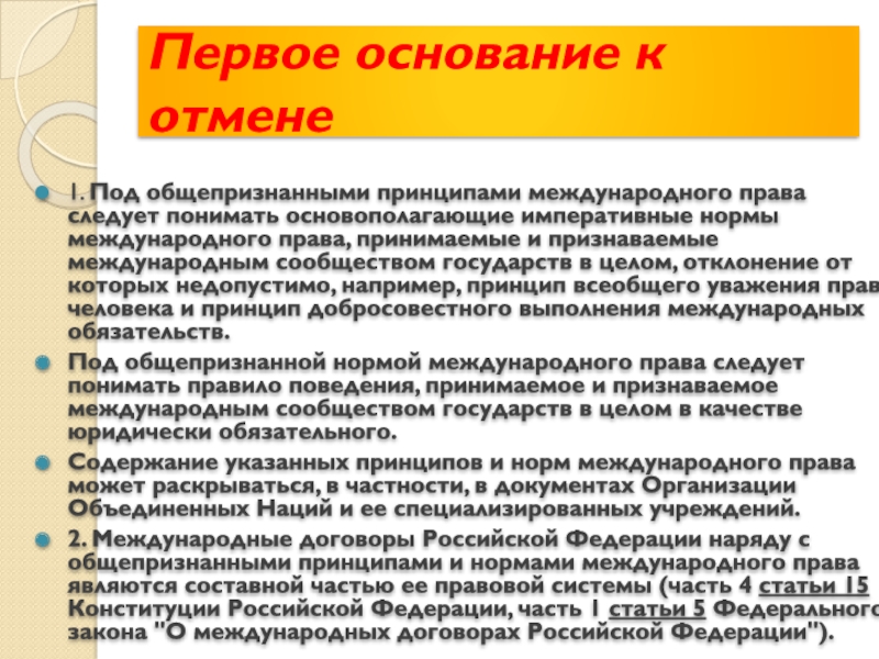 Под общепризнанной нормой международного права следует понимать правило поведения, принимаемое и признаваемое международным сообществом государств в целом в качестве юридически обязательного.