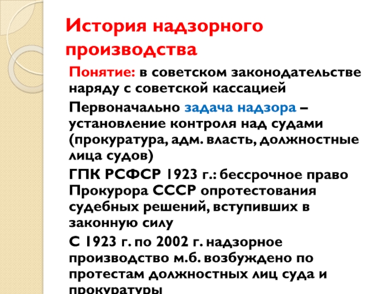 С 1923 г. по 2002 г. надзорное производство м.б. возбуждено по протестам должностных лиц суда и прокуратуры