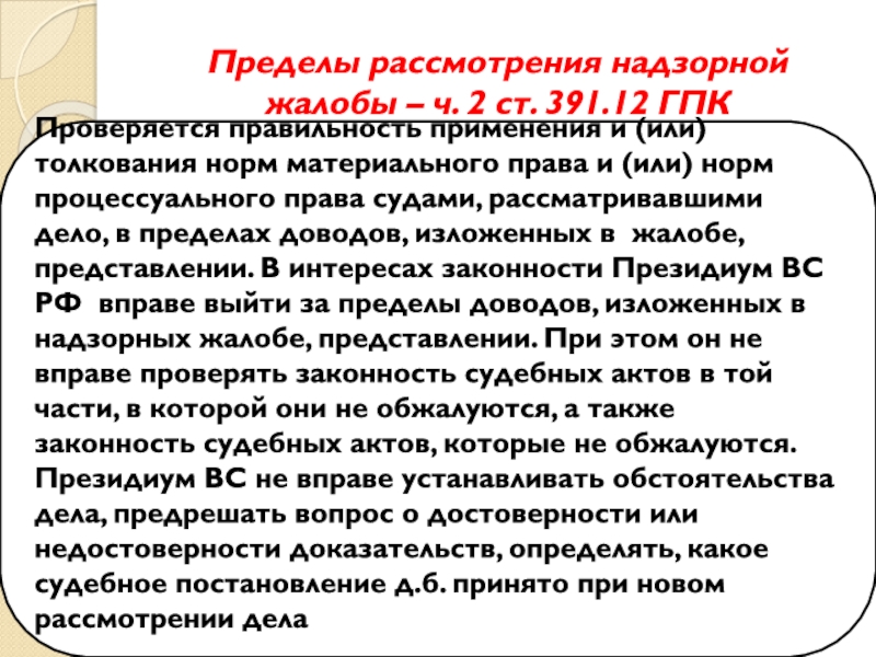 Слайд 15Пределы рассмотрения надзорной жалобы – ч. 2 ст. 391.12 ГПК