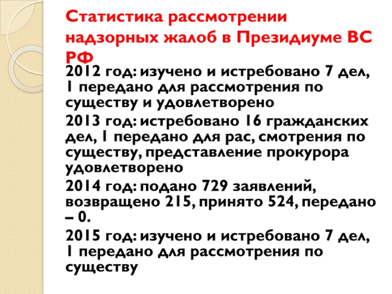 Слайд 19Статистика рассмотрении надзорных жалоб в Президиуме ВС РФ