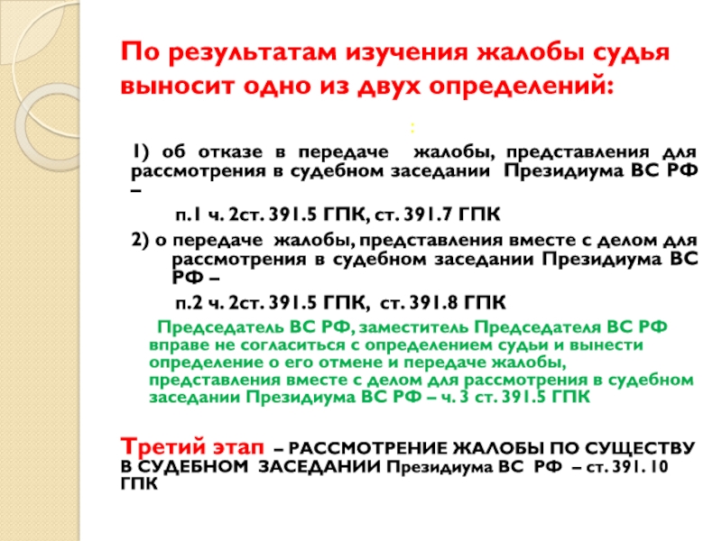 Третий этап – РАССМОТРЕНИЕ ЖАЛОБЫ ПО СУЩЕСТВУ В СУДЕБНОМ ЗАСЕДАНИИ Президиума ВС РФ – ст. 391. 10 ГПК