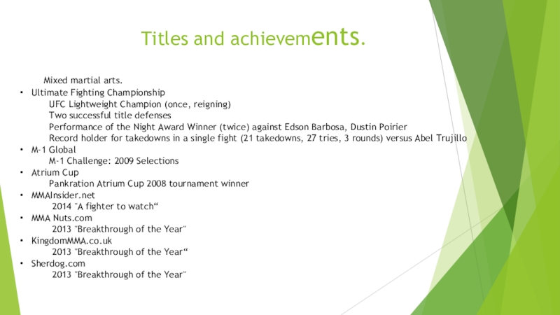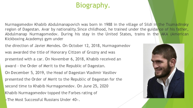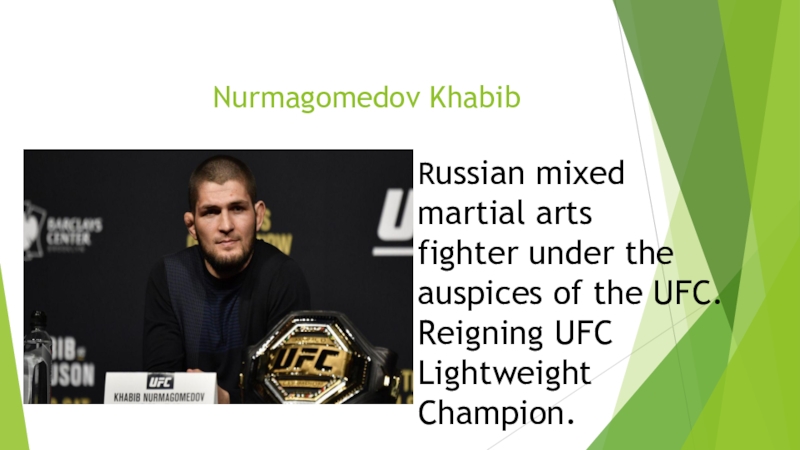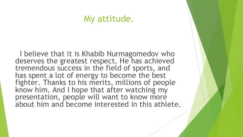 is Khabib Nurmagomedov who deserves the greatest respect. He has achieved tremendous success in the field of sports, and has spent a lot of energy to become the best fighter. Thanks to his merits, millions of people know him. And I hope that after watching my presentation, people will want to know more about him and become interested in this athlete.