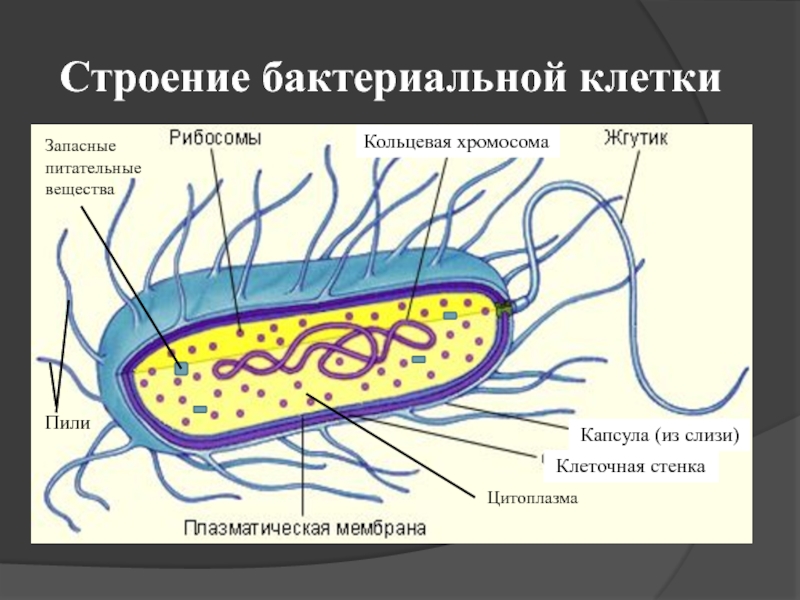 Строение бактериальной клетки Капсула (из слизи) Цитоплазма Клеточная стенкаЗапасные питательные веществаПилиКольцевая хромосома