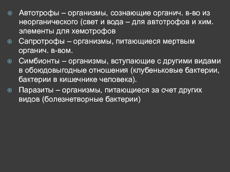 Слайд 14Автотрофы – организмы, сознающие органич. в-во из неорганического (свет и