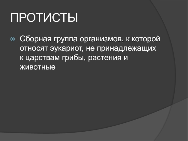 ПРОТИСТЫ Сборная группа организмов, к которой относят эукариот, не принадлежащих к царствам грибы, растения и животные