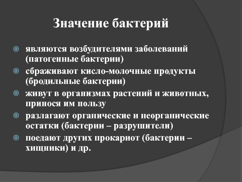 Значение бактерийявляются возбудителями заболеваний (патогенные бактерии)сбраживают кисло-молочные продукты     (бродильные бактерии)живут в организмах растений