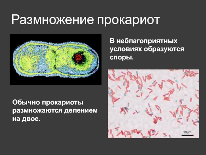 Размножение прокариотОбычно прокариоты размножаются делением на двое.В неблагоприятных условиях образуются споры.