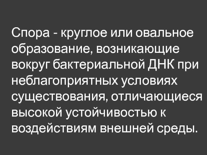 Спора - круглое или овальное образование, возникающие вокруг бактериальной ДНК при неблагоприятных условиях существования, отличающиеся высокой устойчивостью