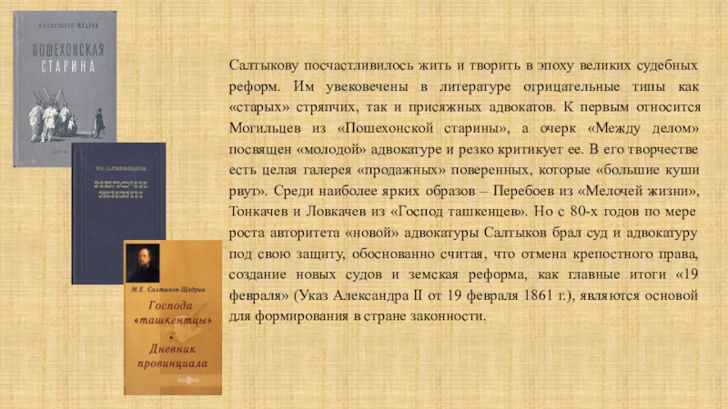 и присяжных адвокатов. К первым относится Могильцев из «Пошехонской старины», а очерк «Между делом» посвящен «молодой» адвокатуре и резко критикует ее. В его творчестве есть целая галерея «продажных» поверенных, которые «большие куши рвут». Среди наиболее ярких образов – Перебоев из «Мелочей жизни», Тонкачев и Ловкачев из «Господ ташкенцев». Но с 80-х годов по мере роста авторитета «новой» адвокатуры Салтыков брал суд и адвокатуру под свою защиту, обоснованно считая, что отмена крепостного права, создание новых судов и земская реформа, как главные итоги «19 февраля» (Указ Александра II от 19 февраля 1861 г.), являются основой для формирования в стране законности.