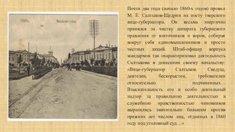 аппарата губернского правления от взяточников и воров, собирая вокруг себя единомышленников и просто честных людей. Штаб-офицер корпуса жандармов так охарактеризовал деятельность Салтыкова в донесении своему начальству: «Вице-губернатор Салтыков. Сведущ, деятелен, бескорыстен, требователен относительно подчиненных… Взыскательность его и особо деятельный надзор за правильною деятельностью и служебною нравственностью чиновников выразились значительно большим против прежних лет числом лиц, отданных в 1860 году под уголовный суд…»