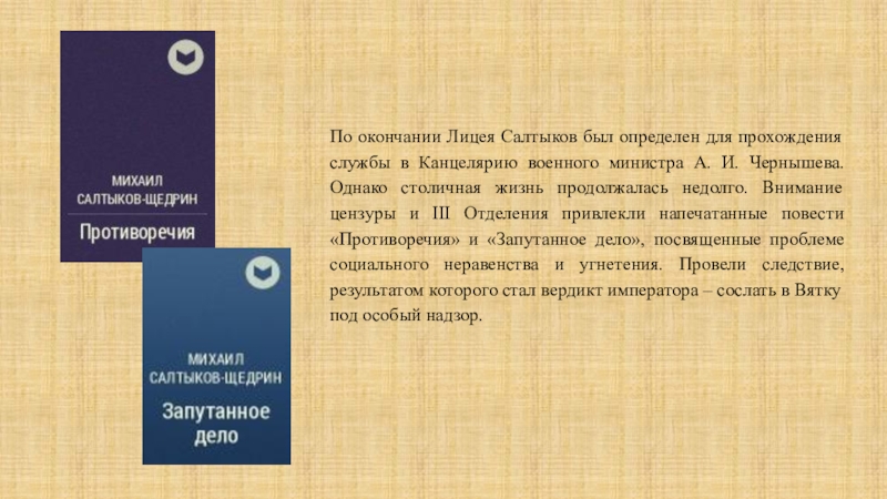 недолго. Внимание цензуры и III Отделения привлекли напечатанные повести «Противоречия» и «Запутанное дело», посвященные проблеме социального неравенства и угнетения. Провели следствие, результатом которого стал вердикт императора – сослать в Вятку под особый надзор.