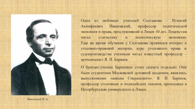 Слайд 4Один из любимых учителей Салтыкова – Игнатий Акинфиевич Ивановский, профессор