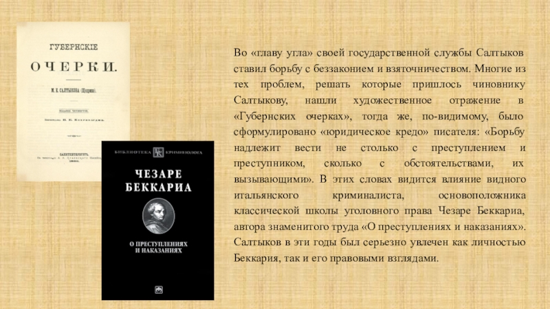 чиновнику Салтыкову, нашли художественное отражение в «Губернских очерках», тогда же, по-видимому, было сформулировано «юридическое кредо» писателя: «Борьбу надлежит вести не столько с преступлением и преступником, сколько с обстоятельствами, их вызывающими». В этих словах видится влияние видного итальянского криминалиста, основоположника классической школы уголовного права Чезаре Беккариа, автора знаменитого труда «О преступлениях и наказаниях». Салтыков в эти годы был серьезно увлечен как личностью Беккария, так и его правовыми взглядами.