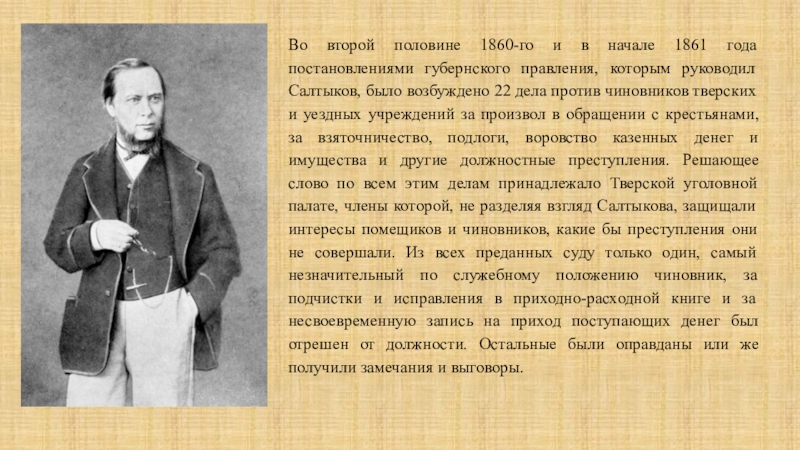 чиновников тверских и уездных учреждений за произвол в обращении с крестьянами, за взяточничество, подлоги, воровство казенных денег и имущества и другие должностные преступления. Решающее слово по всем этим делам принадлежало Тверской уголовной палате, члены которой, не разделяя взгляд Салтыкова, защищали интересы помещиков и чиновников, какие бы преступления они не совершали. Из всех преданных суду только один, самый незначительный по служебному положению чиновник, за подчистки и исправления в приходно-расходной книге и за несвоевременную запись на приход поступающих денег был отрешен от должности. Остальные были оправданы или же получили замечания и выговоры.