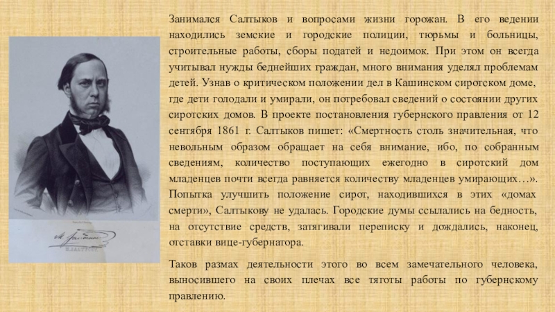 податей и недоимок. При этом он всегда учитывал нужды беднейших граждан, много внимания уделял проблемам детей. Узнав о критическом положении дел в Кашинском сиротском доме, где дети голодали и умирали, он потребовал сведений о состоянии других сиротских домов. В проекте постановления губернского правления от 12 сентября 1861 г. Салтыков пишет: «Смертность столь значительная, что невольным образом обращает на себя внимание, ибо, по собранным сведениям, количество поступающих ежегодно в сиротский дом младенцев почти всегда равняется количеству младенцев умирающих…». Попытка улучшить положение сирот, находившихся в этих «домах смерти», Салтыкову не удалась. Городские думы ссылались на бедность, на отсутствие средств, затягивали переписку и дождались, наконец, отставки вице-губернатора.
